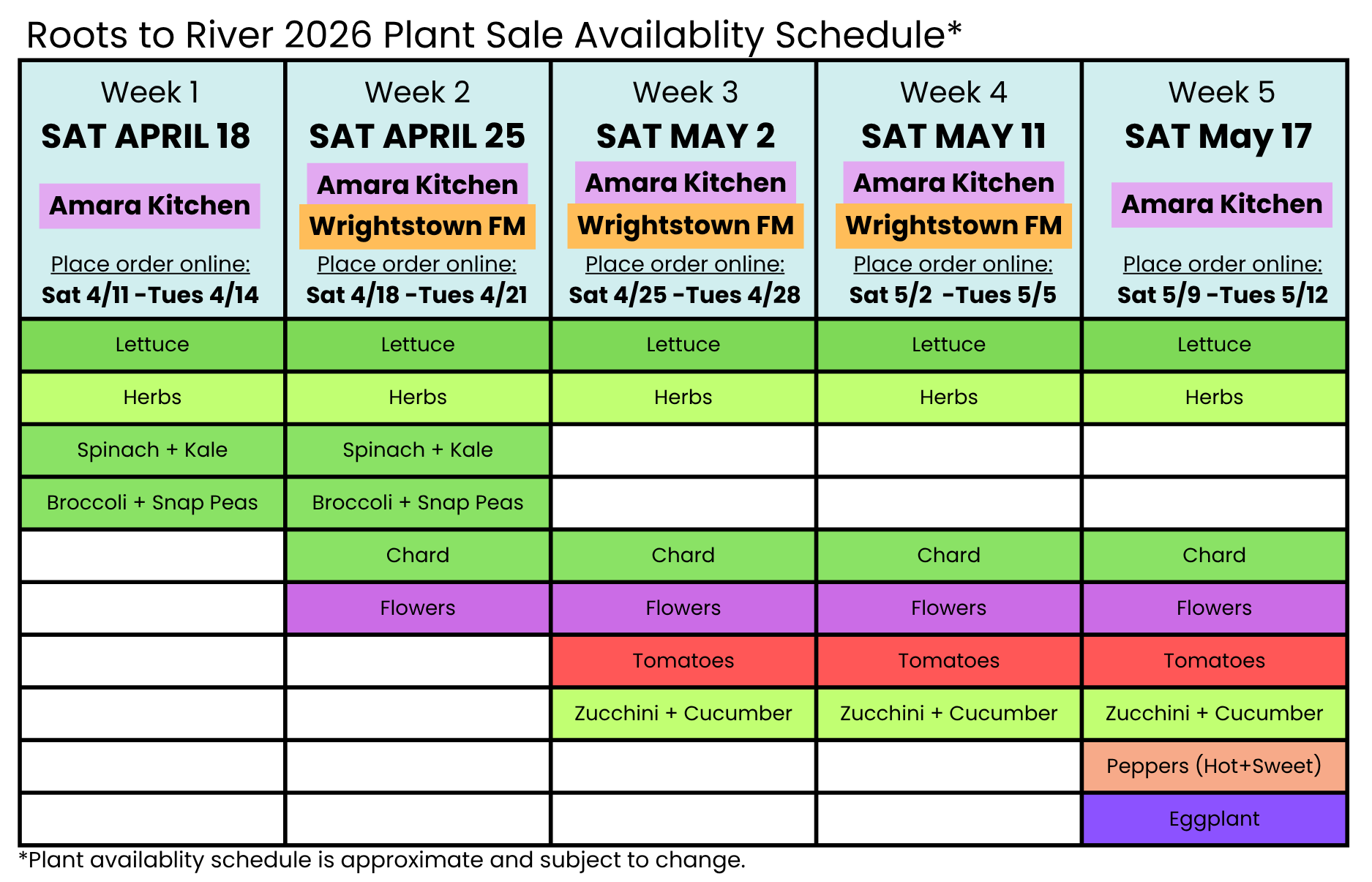 If you’d rather shop in person instead of pre-ordering, you’re welcome to pick out your plants at the Wrightstown Farmers Market, or at Amara Kitchen on May 2 and May 9.