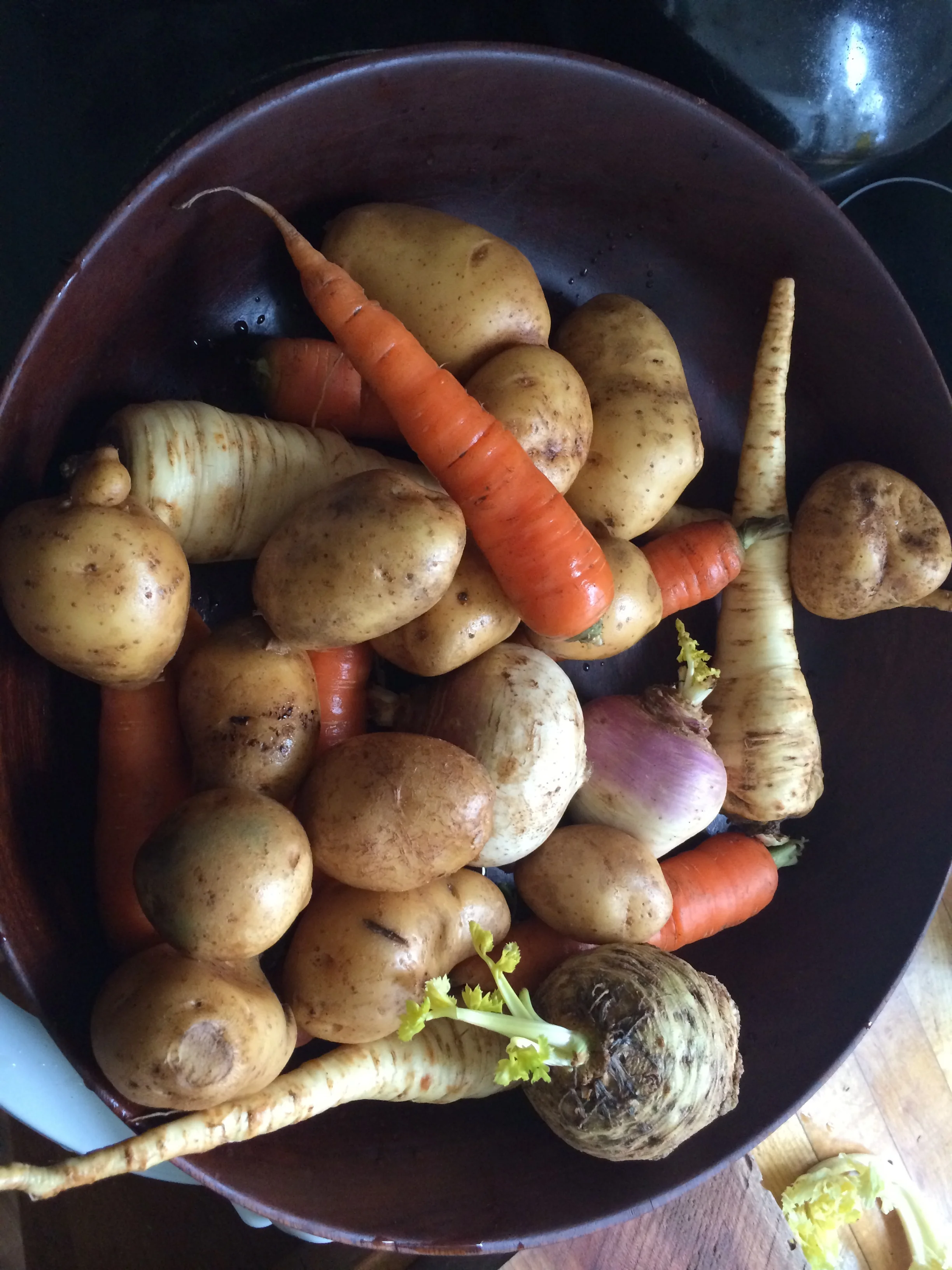 Free choice of 5 to 6 items per week of of stored veggies straight from the root cellar (beets, rutabaga, carrots, radishes, cabbage, radicchio, potatoes, garlic, and butternut squash), greens from the field and our unheated greenhouses. We will send you a harvest list for you to choose your items each week.